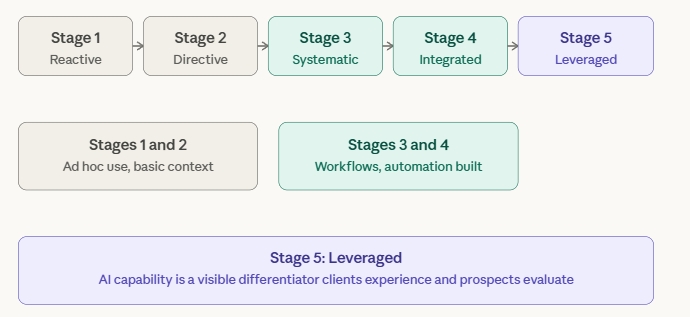 Most practitioners reading this are at Stage 1 or Stage 2. Stage 3 is where consistent quality begins. Stage 5 is where your AI capability becomes a visible competitive differentiator that clients experience directly and prospects evaluate before they engage you.